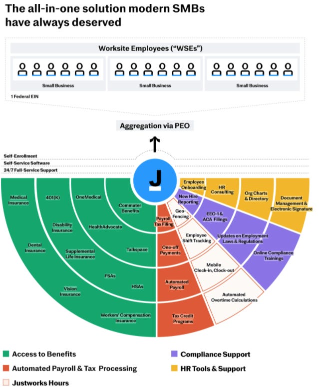 Focusing more on what the Company actually does, in more traditional HR parlance, Justworks is a PEO (Professional Employer Organization) - an organization that enters into a joint-employment relationship with an employer by leasing employees to the employer, thereby allowing the PEO to share and manage many employee-related responsibilities and liabilities. For you real-estate heads out there, think of a PEO as the sale-leaseback equivalent for HR services. This allows employers to outsource various HR functions, like employee benefits, compensation and payroll admin, workers comp, taxes, etc. PEO’s are the employer of their clients’ employees - this provides economies of scale by having more benefits options for its employees as well as reduce the HR administrative burden that most small businesses can’t afford to manage themselves.