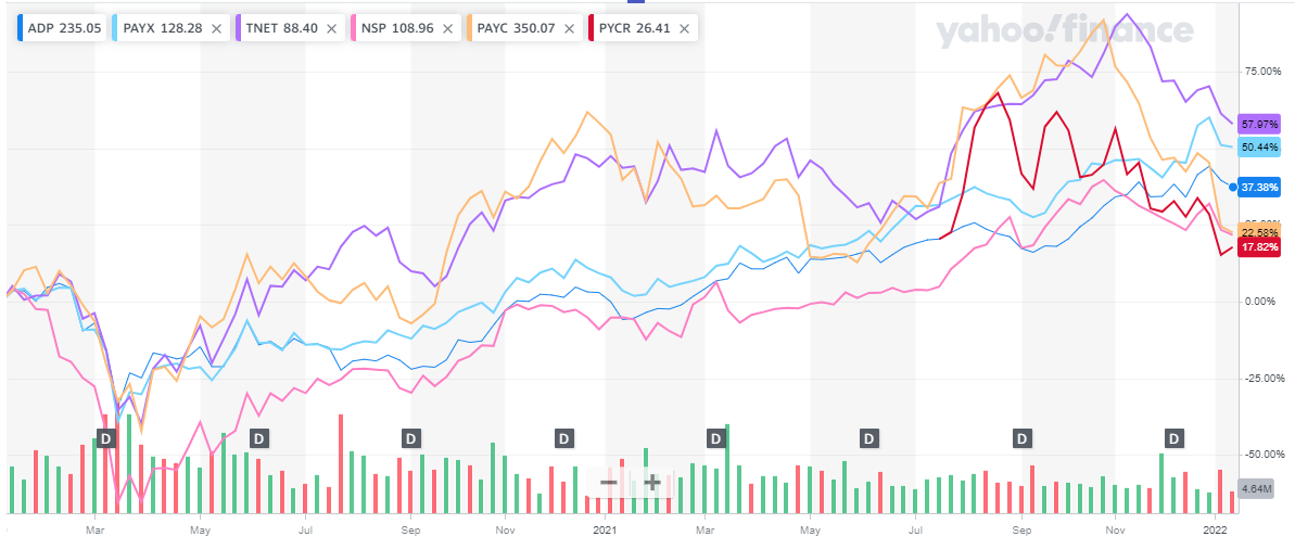 Paychex: About half the size of ADP, the company has a market cap of $44 billion and employs 15,000 employees. The company offers an incredible robust suite of services, mostly in the human capital management space, but it also provides insurance coverage. It is currently trading at an EV/EBITDA multiple of 24.4x