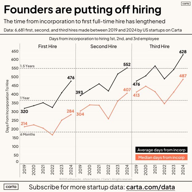 I like the above chart because it cuts to the heart of the issue – founders are able to get more done, so they are taking longer to make first, second, and third hires. Again, part of this has to do with less capital in the ecosystem. But companies at the earliest stages are always cash constrained (unless you are a co-founder of OpenAI and just launched a new AI company), and only hire when they absolutely must. And what the data is telling us is that founders “absolutely must” hire more people later in the cycle.