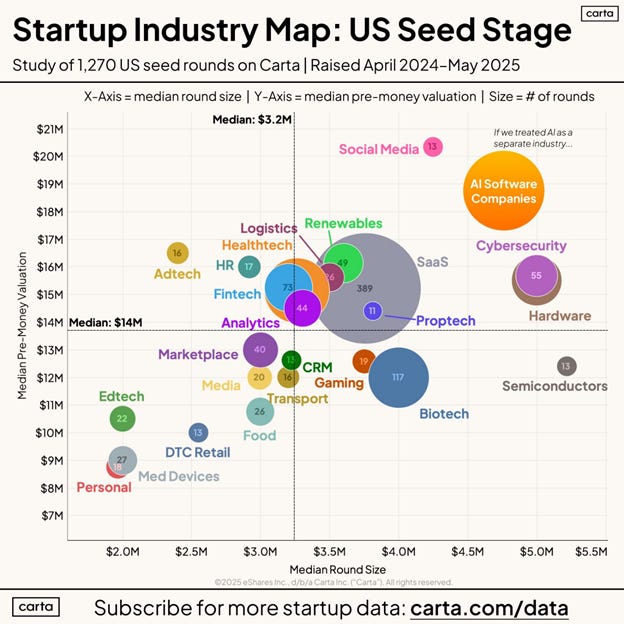 In Q2, five AI deals topped $1 billion in value, including Scale AI, Safe Superintelligence, and Thinking Machines. Safe Superintelligence raised $2 billion, after previously raising $1 billion. Now it’s hard to tell, but from the outside looking in, those appear to be pre-seed and seed rounds by normal company status metrics (product state, revenue, etc.). In Q1 2025, OpenAI raised a $40 billion round. That was close to half of all deal value in that quarter alone. Do deals with OpenAI even count as venture anymore?