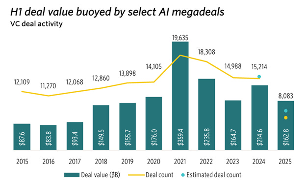 Thesis: The apparent recovery in venture capital is less a broad-based resurgence and more a distortion driven by a handful of AI megadeals. In the first half of 2025, over half of global VC dollars flowed into fewer than a dozen AI startups—most of them linked to OpenAI alumni—while the rest of the market remains sluggish. Talent wars, billion-dollar “seed” rounds, and unprecedented growth trajectories have created froth that looks like a bubble, but the reality is more complex: even if 95% of pilots fail, the winners are scaling faster than anything we’ve seen since the internet. Whether today’s prices hold or not, AI is already reshaping how companies raise, hire, and grow—and execution, not hype, will determine which of these firms endure.